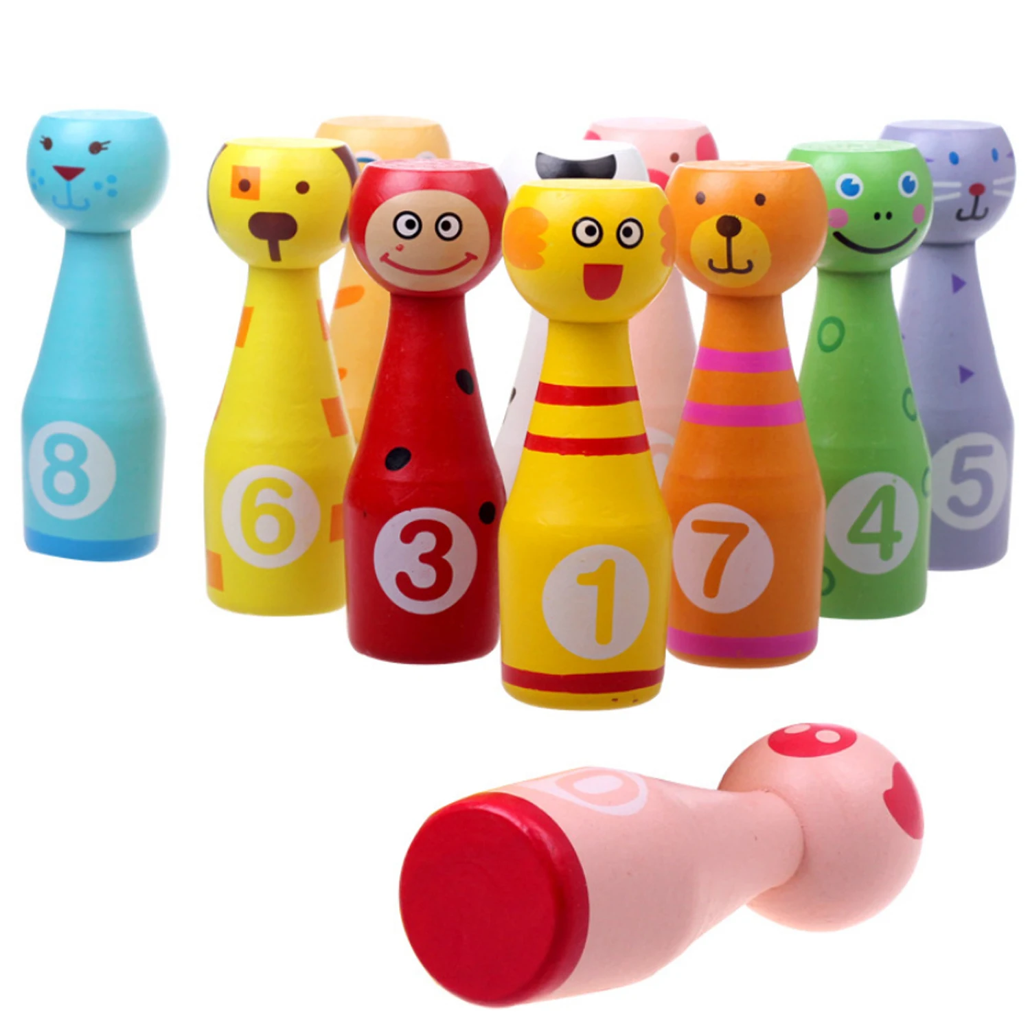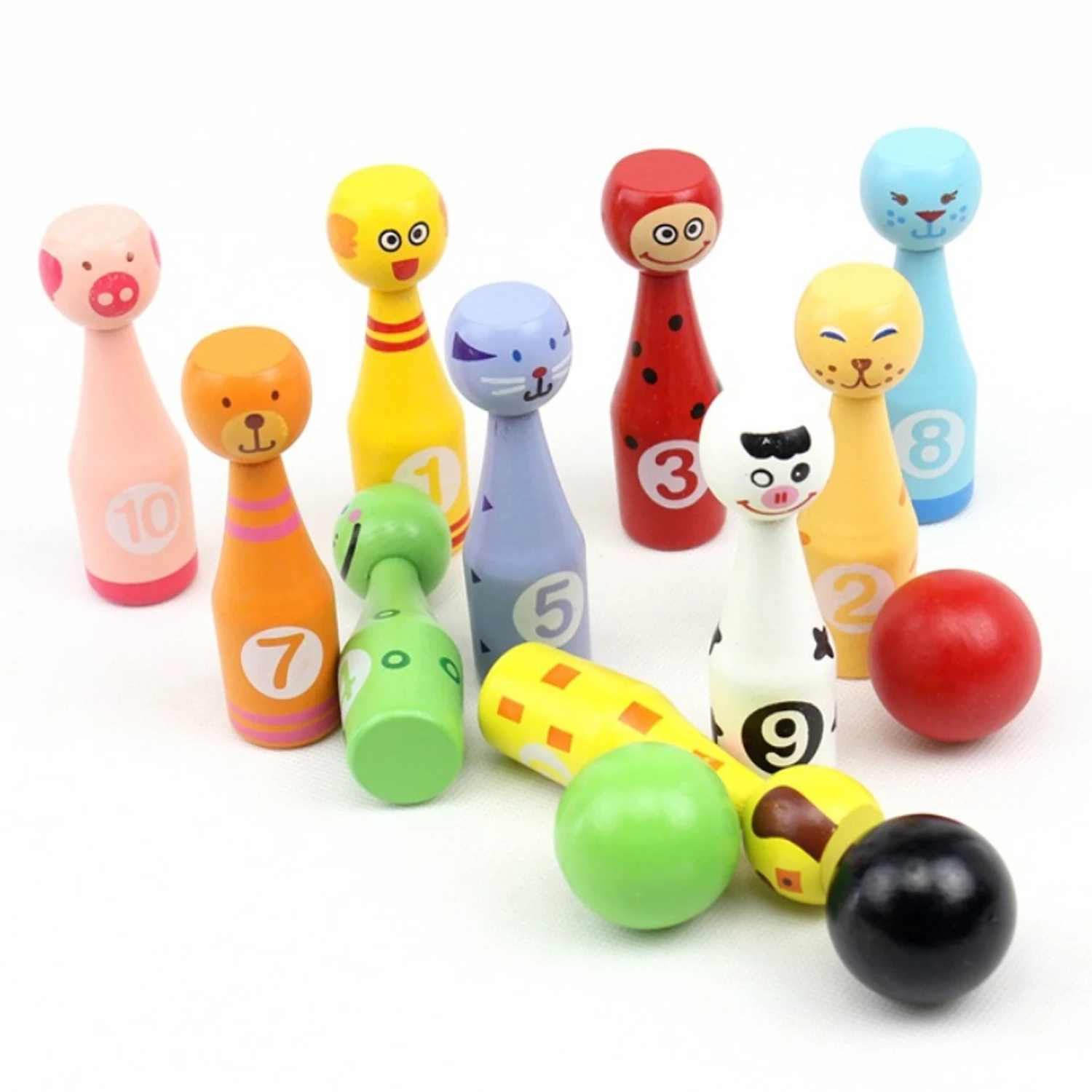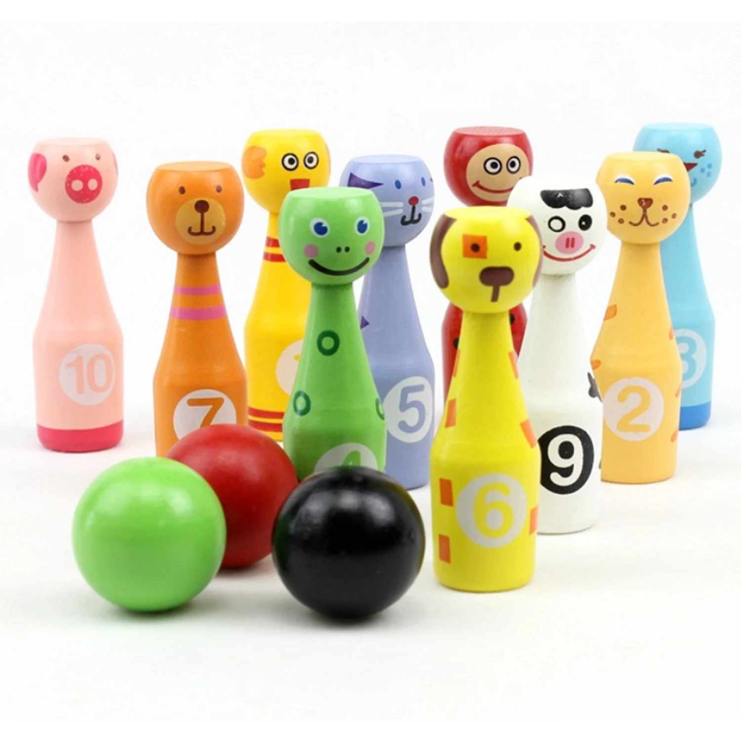 10PCS Pins + 3PCS Balls Cute Cartoon Natural Wooden Bowling Game Toy Kids Gift Details: - Play the bowling game with your kids, to make you and their relationship become more intimate. - Made of natural wood, which is eco-friendly, non-toxic, lightweight and anti-pressure, safe to use. - Bright color and cute outlook can attract your child's attention and keep them entertained for hours.