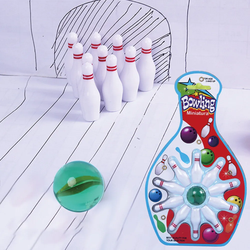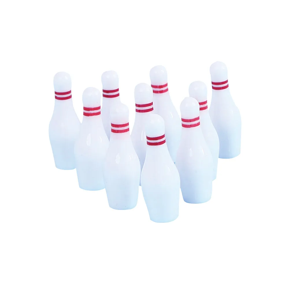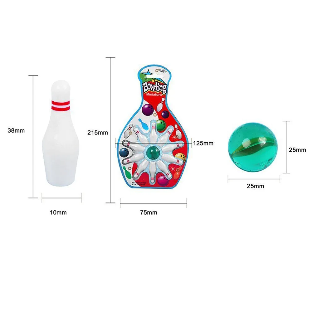 Set comes with 10 solid bowling pins measuring 1.5 inches tall and 1 clear bowling ball measuring 1 inch across.
