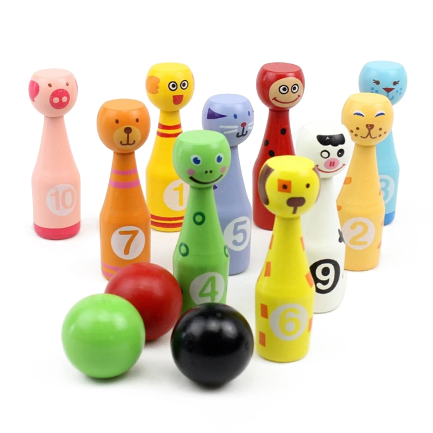 10PCS Pins + 3PCS Balls Cute Cartoon Natural Wooden Bowling Game Toy for Kids Children Birthday Christmas Festival Gift