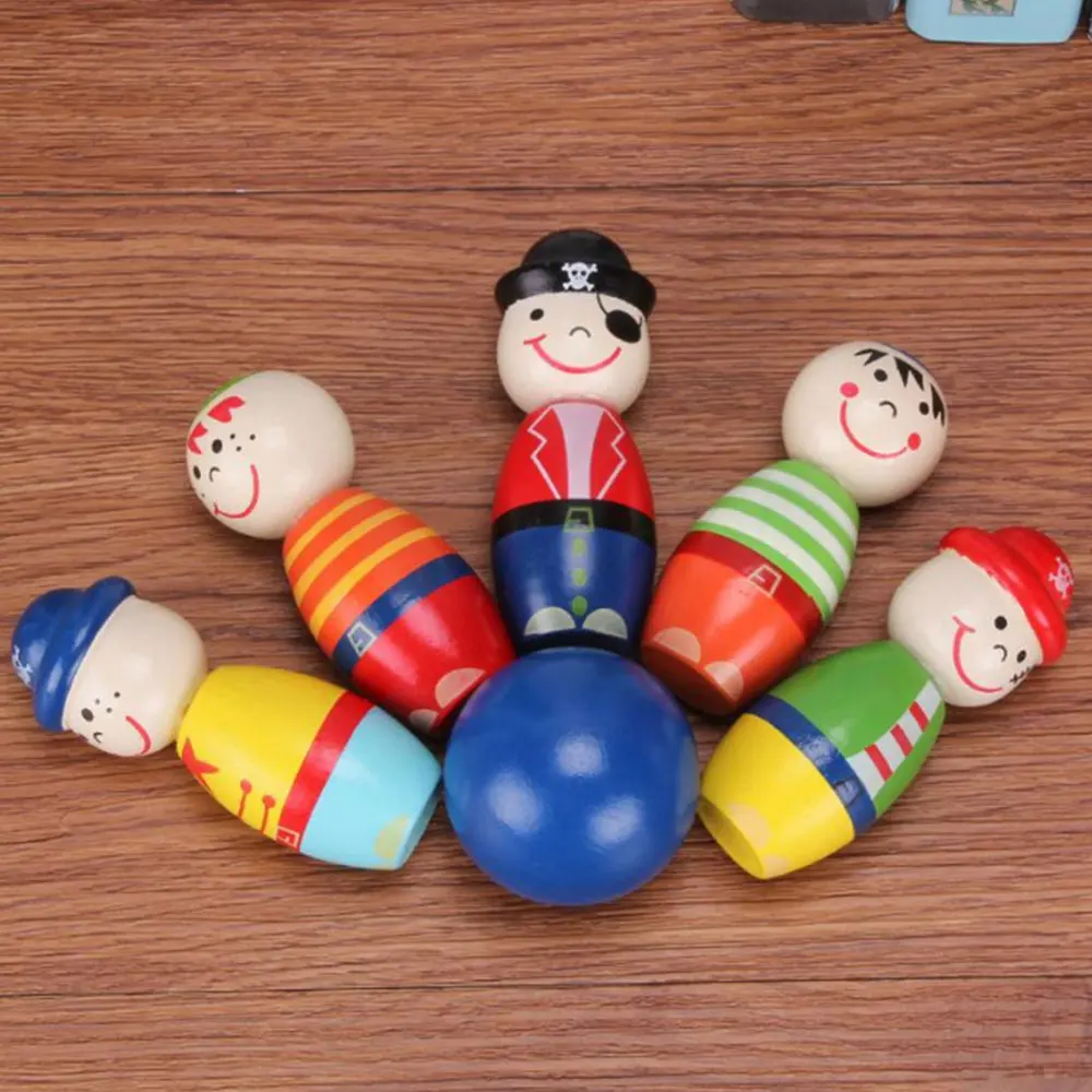 Cheap 6Pcs Wooden Indoor Outdoor Set Bowling Pirate Ball Cartoon Handcrafted Play
